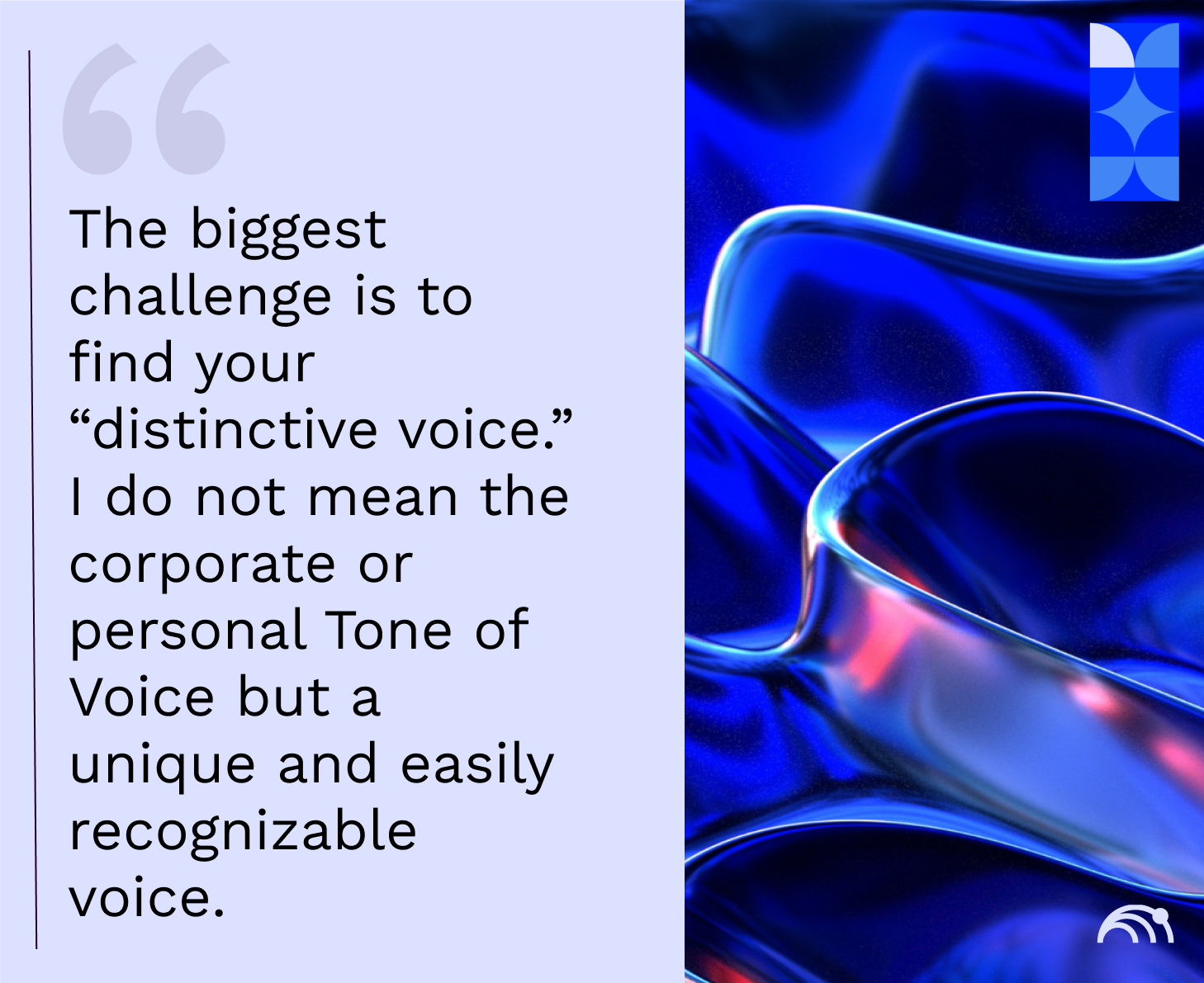 Today we have a variety of media modalities that allow us to go beyond writing and enable a company to seek its style by playing on its characteristic strengths: images, videos, audio, podcasts mixed in a way that reflects you. And here I see a lot of explorations with Artificial Intelligence: how can AI increase the reach of your distinctive voice?